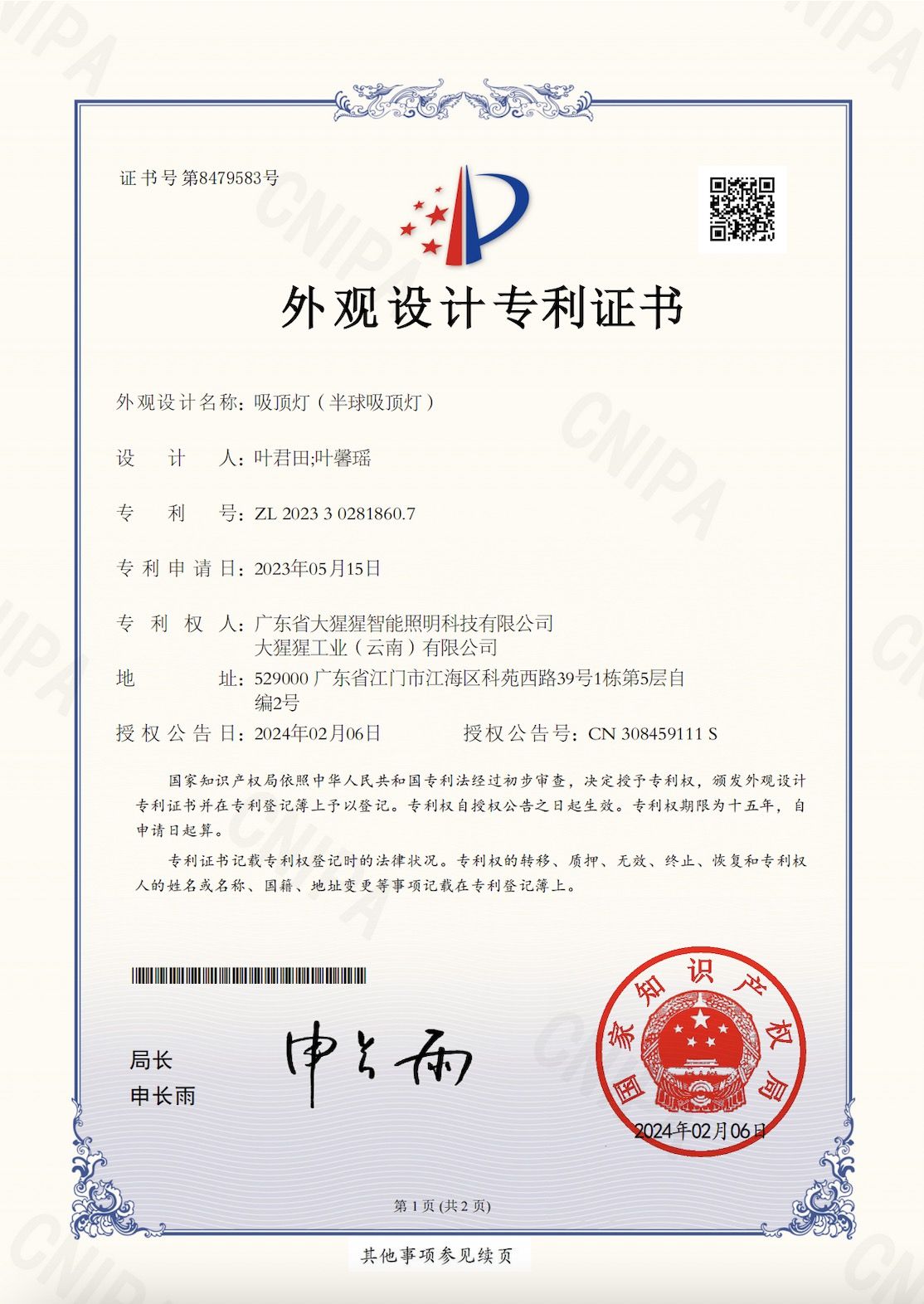 吸顶灯专利证书