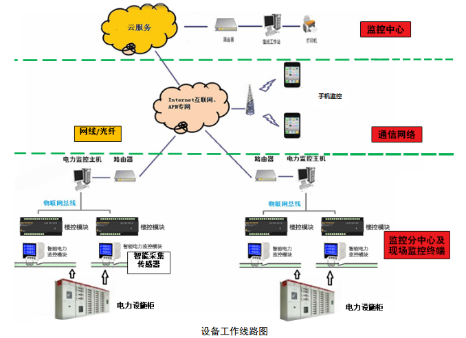 智能电力监控模块,通过自身配备的3G/4G/5G无线通信设备与监控中心平台软件实现互联,实现大型建筑的用电安全和能耗实时监控。