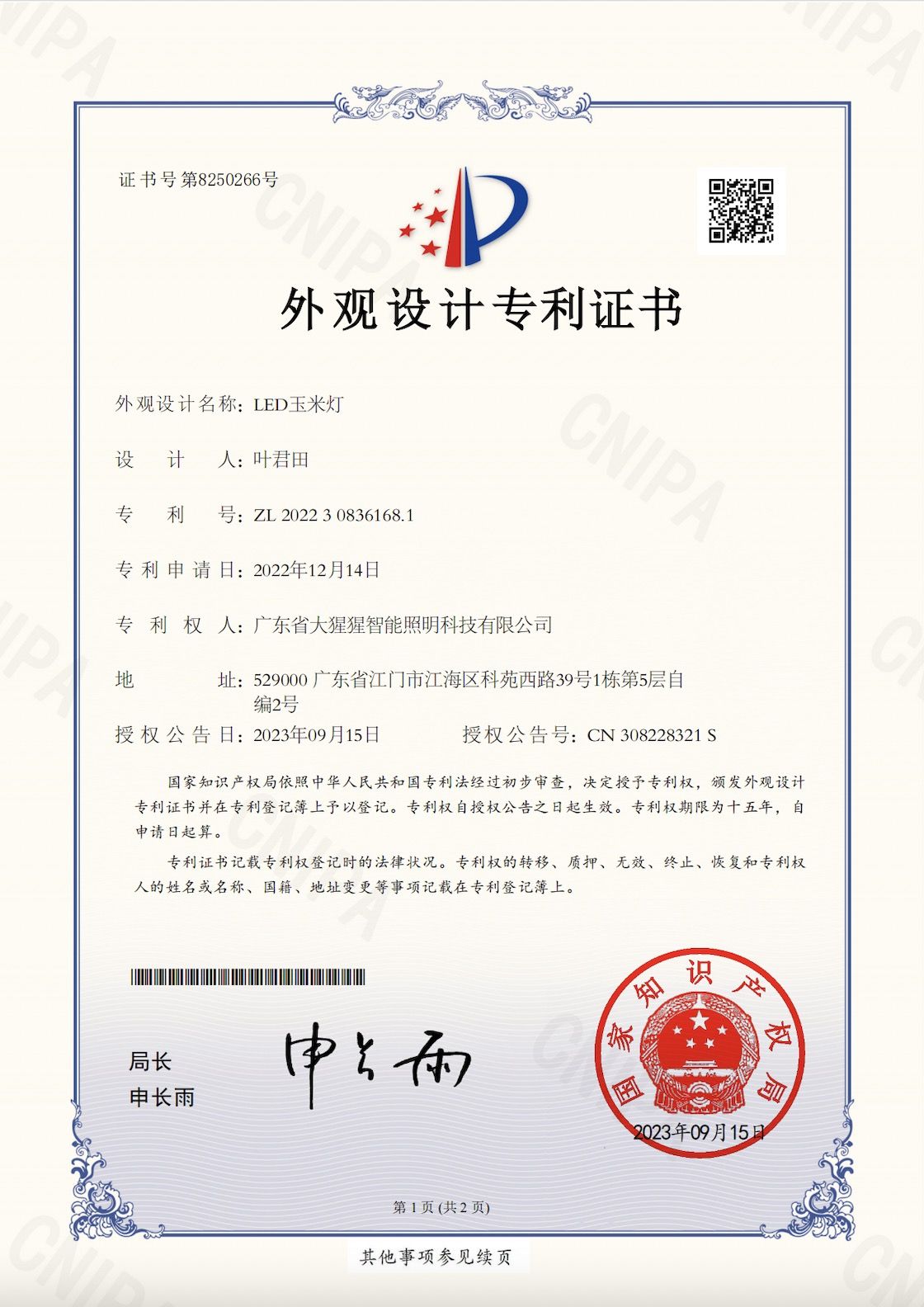 玉米灯专利证书